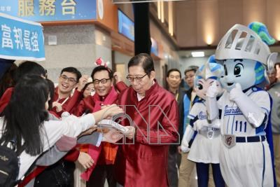 富邦集團董事長蔡明忠(中左紅圍巾者)、富邦金董事長蔡明興(前中)24日傍晚現身台北南港展覽館準備出席謝年會,現場並與集團員工近距離互動。