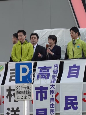日本第51屆眾議院選舉27日正式公告,2月8日投開票。自民黨總裁高市早苗(前排中)與日本維新會代表吉村洋文(前排左)、共同代表藤田文武(前排右)上午在東京秋葉原站前共同發表首場街頭演說。高市明確表示,將「執政黨是否維持過半數」作為勝敗標準,若未達標將「退陣」(辭職)。
