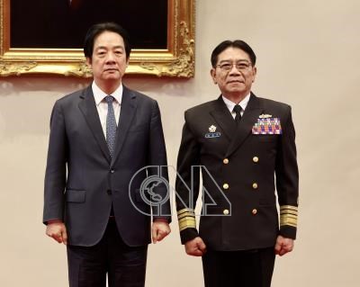總統賴清德(左)28日在總統府主持中華民國115年2月份將官晉任授階典禮,海軍少將許志中(右)晉任海軍中將。