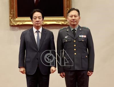 總統賴清德(左)28日在總統府主持中華民國115年2月份將官晉任授階典禮,陸軍上校陳健中(右)晉任陸軍少將。