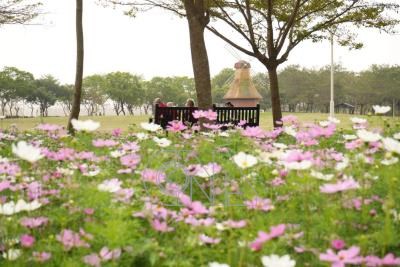 屏東縣新埤鄉貓頭鷹共融公園園區內有生態埤塘及林蔭步道等,目前花海也已盛開,縣府推薦民眾春節前來賞花走春。