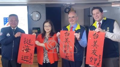 農曆春節將近,海委會主委管碧玲(左2)30日邀請美國在台協會(AIT)處長谷立言(右2)、高雄分處長張子霖(右)等人一同登上雲林艦並寫春聯揮毫。