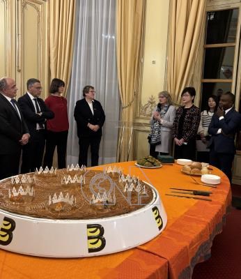 駐法代表處3日邀請法國各界友人共享巨型國王派,駐法代表郝培芝(右3)感謝他們長期支持台灣,過去一年在各領域致力強化雙邊關係。