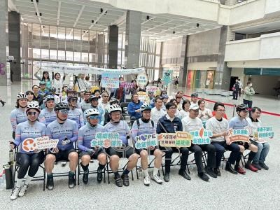 癌症希望基金會(HOPE)響應「世界癌症日」發起「健康台灣,讓希望滾動全台」北高騎行行動。4日車隊完成任務抵達終點高雄市政府,高雄市長陳其邁(右5)與車隊推廣健康篩檢。