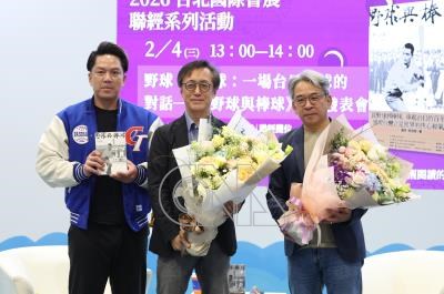 「野球X棒球:一場台日棒球的對話——『野球與棒球』新書發表會」4日下午在2026台北國際書展藍沙龍舉行,由日本作家野島剛(中)、文字工作者謝仕淵(右)對談,亞洲棒球總會會長特助周思齊(左)則以神秘嘉賓身分亮相。