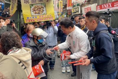 民眾黨主席黃國昌(前右2)7日上午在民眾黨籍新北市議員陳世軒(前右)陪同下,前往新莊區宏泰傳統市場發送春聯、紅包,與攤商互動拜年。黃國昌也逐一彎腰致意、問候新年好。