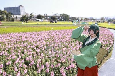 2026台北古亭河濱公園花海陸續綻放,14日有coser在粉色花田前拍照,花海與城市景觀交織。