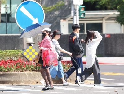 交通部中央氣象署指出,15日小年夜台灣各地大多為晴到多雲,白天溫暖偏熱,彰化以北沿海高溫約攝氏23至26度。圖為台北市松山區民眾撐傘遮擋陽光。
