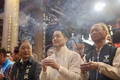 台北市長蔣萬安(中)18日大年初二走春行程一早就開跑,上午先到士林慈諴宮參香,祈求萬事平安、風調雨順。