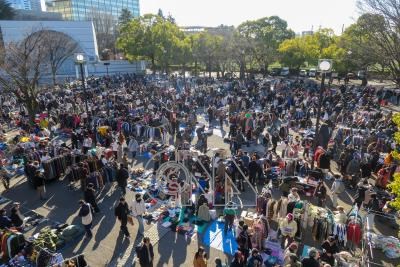 日本東京代代木公園的跳蚤市場知名度高,現場販售各式二手衣物、品牌時裝、稀有古董食器、手工藝品、書籍、黑膠唱片、玩具、紀念品等,吸引不少舊物愛好者前往尋寶,圖為2026年1月市集熱絡場面。