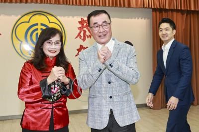 台北市議會23日上午舉行新春團拜,台北市副市長李四川(中)在會前受訪宣布已經向市長蔣萬安(右)遞出辭呈,國民黨台北市議員秦慧珠(左)上前與他合影。