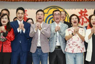 台北市議會23日上午舉行新春團拜,台北市長蔣萬安(前排左2)與台北市副市長李四川(前排左4)、台北市議長戴錫欽(前排左3)等人出席,拱手拜年。