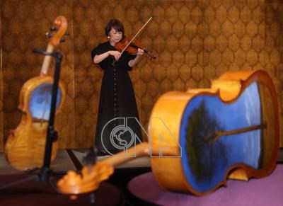 中央社記者張新偉攝 115年2月26日###0001中澤宗幸妻子、小提琴家中澤裕子0002中澤宗幸妻子、小提琴家中澤裕子現場以「海嘯提琴」(圖)演出0003中澤宗幸妻子、小提琴家中澤裕子###