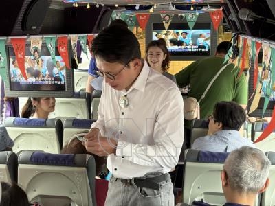 台灣民眾黨新北市長參選人黃國昌(中)主辦「金嗓大賽」,歡唱巴士2日啟動巡迴,邀滿60歲長者高歌,角逐歌王、歌后,黃國昌在遊覽車上化身剪票員與長者互動。