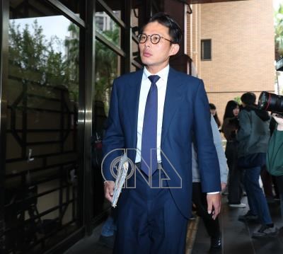 民眾黨主席黃國昌(前)於114年擔任立委期間,在立法院司法及法制委員會質詢時播放疑似檢察官偵訊錄音惹議,遭告發涉偽造文書罪,台北地檢署3日以他字案被告身分傳喚黃國昌(中)說明。