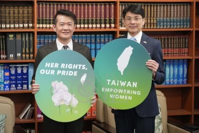 外交部3日舉辦記者會,由非政府組織國際事務會副執行長康嘉棋(左)以及外交部發言人蕭光偉(右)公布今年「台灣性別平等週」主視覺。