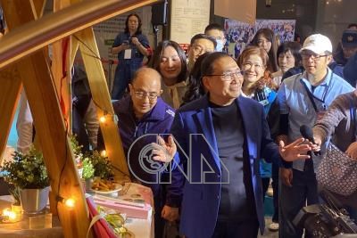 新北市政府高灘地工程管理處3日舉辦「2026新北春紛節」記者會,市長侯友宜(中)在記者會後巡視活動展示攤位,體驗復古回憶風。
