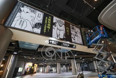 世界棒球經典賽即將開打,文化部在台北大巨蛋展出13幅「壘上有人」特展台灣漫畫看板,3日現場持續進行布置作業,工作人員以升降車張貼看板。
