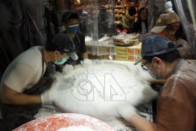 台北市南門市場一間人氣糕糰店的元宵湯圓採手工製作,每逢元宵節便會有大批民眾排隊購買,3日在現場還能看到商家以傳統技法搖元宵。