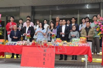 中視電視劇「樓上樓下」開鏡記者會5日下午在台北舉行,中視董事長盧秀芳(前右4)、執行製作翁家明(前右3)與演員群一同開鏡拜拜祈求拍攝順利。