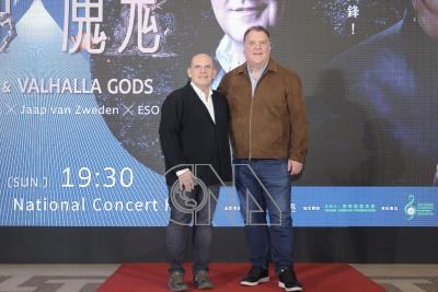 兩廳院傳奇男中音布萊恩特菲爾(Bryn Terfel)(右)抵台記者會7日在台北舉行,此次來台將與指揮名家梵志登(Jaap van Zweden)(左)、長榮交響樂團一同攜手於2026台灣國際藝術節演出。