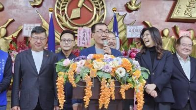 擬參選新北市長的台北市副市長李四川(前中)9日出席新北市議會國民黨團幹部交接儀式,致詞時表示,回來新北市這一個大家庭,心中滿滿回家的感覺,他會和議員共同努力,打好這一仗。