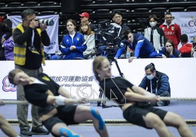 世界室內拔河錦標賽首度在台灣舉行,烏克蘭拔河國家隊選手、現役烏克蘭軍人的謝夫楚克參加女子和男女混合項目。圖為謝夫楚克(後左藍色外套者)12日為烏克蘭國家隊的隊友加油。