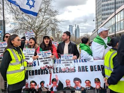 數百名旅英伊朗民眾15日在倫敦集會,抗議德黑蘭當局的神權恐怖統治,並舉標語「這是最終決戰;你們的恐怖分子領導人都死了」。
