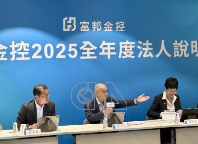 富邦金16日舉行2025年全年營運成果暨IFRS 17與新一代清償能力制度法說會。富邦金總經理韓蔚廷(中)、北富銀總經理郭倍廷(左)、富邦人壽執行副總經理董采苓(右)均出席。