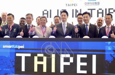 2026智慧城市展台北市政府願景館17日在台北南港展覽館舉行開幕,台北市長蔣萬安(前排右3)、立法院副院長江啟臣(前排右2)等一同主持開幕式。
