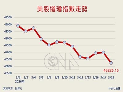 (中央社台北19日電)美國聯邦準備理事會(Fed)在政策會議上宣布利率按兵不動,加上官員正評估美以聯合攻打伊朗帶來的經濟風險,美股主要股市18日收黑。道瓊工業指數下滑768.11點或1.63%,收報46225.15點。標普500指數下挫91.39點或1.36%,收在6624.70點。那斯達克指數下跌327.11點或1.46%,收22152.42點。費城半導體指數下滑41.70點或0.53%,收7795.13點。1150319