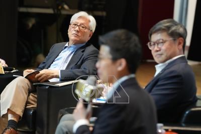 詩人李敏勇(左)與世代文化創業群創辦人周奕成(右)、社民黨台北市議員苗博雅(前)21日下午齊聚中正紀念堂出席「總統直選30週年鼎談會」,和與會者共同回望1996年首次總統直選及台灣政治民主發展歷程。