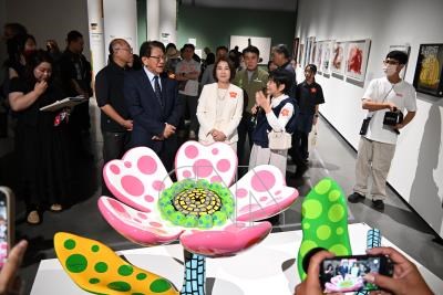 屏東縣立美術館27日開幕,總統府祕書長潘孟安(前左)、屏東縣長周春米(前中)等人,一起欣賞日本藝術家草間彌生作品「花朵正在綻放」。