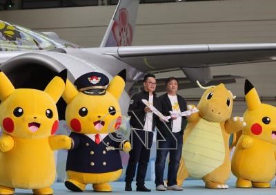 中華航空1日亮相與The Pokemon Company攜手打造的第2架寶可夢彩繪機「皮卡丘彩繪機CI2」,華航總經理陳漢銘(左)、The Pokemon Company董事福永晋(右)在台上合影留念。