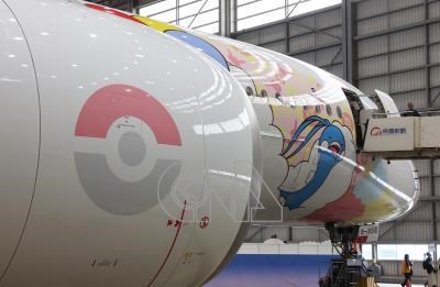中華航空1日亮相與The Pokemon Company攜手打造的第2架寶可夢彩繪機「皮卡丘彩繪機CI2」,引擎上也藏有小巧思,隨處可見寶貝球等圖騰設計。