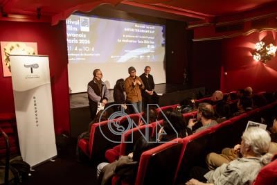 巴黎台灣電影節由駐法台灣文化中心、巴黎拉丁區指標藝文電影院Filmothèque共同合作。圖為4月1日開幕片現場,左1為戲院負責人柯塞,右1為法國影評人傅洛東,右2為本屆焦點影人曹仕翰。