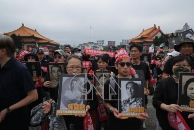「台灣不需要獨裁者紀念堂」快閃行動由近30個公民團體共同發起,5日下午在台北中正紀念堂登場,與會民眾手持政治受難者相片、身穿黑衣表達訴求。