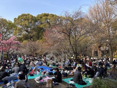 日本櫻花季到來,各地賞櫻景點湧入大量遊客。民眾一般會自備鋪布、食品飲料,在櫻花樹下席地而坐。圖為上野公園在櫻花樹下野餐的遊客。