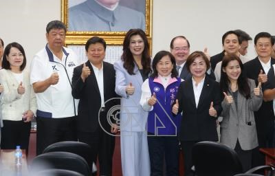 國民黨主席鄭麗文(左4)7日上午在中央黨部舉行「2026和平之旅」啟程中外記者會,和與會的立委、中常委等人比讚合影。