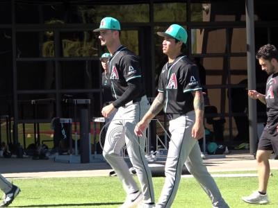 美國職棒響尾蛇小聯盟投手總監密爾茲稱讚台灣左投林昱珉(前)擁有數一數二的運動天分。圖為林昱珉3月18日在春訓基地暖身。