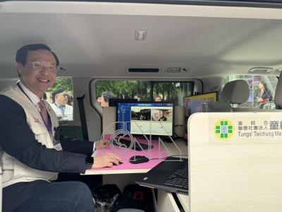 「智慧行動醫療隨扈系統」由7人座純電動車擔任「行動指揮車」,而電動三輪車可靈活穿梭人群,迅速抵達現場進行初步處置。衛福部長石崇良(前)8日體驗。