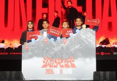 樂團滅火器8日下午在台北舉行記者會,宣傳ON FIRE DAY台北小巨蛋演唱會,主唱楊大正(右)和團員進行「插旗儀式」,回顧成軍以來的重要事件。