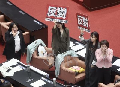 民眾黨立法院黨團10日在立法院會提案,要求第11屆第5會期(本會期)延會至7月31日,民進黨立委在議場內舉牌表達反對立場。